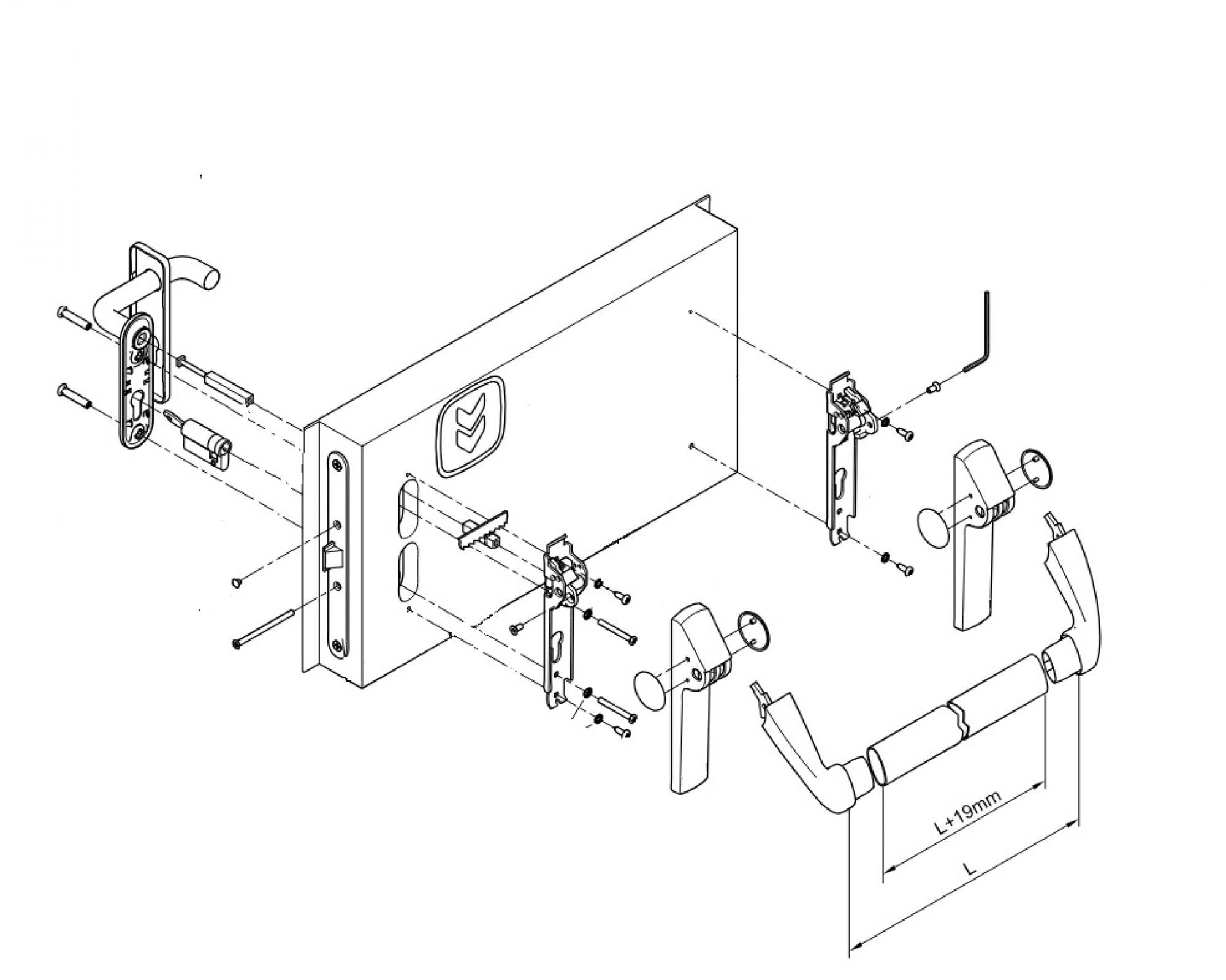 Compreso (fornito in imballo): serratura antipanico entrata 65 mm, riscontro serratura in plastica nera, meccanismi in acciaio zincato, carter in plastica nera, bracci in plastica nera con anima in acciaio, barra alluminio anodizzato, comando esterno in plastica nera, mezzocilindro, pittogramma adesivo (freccia verde), istruzioni di montaggio.